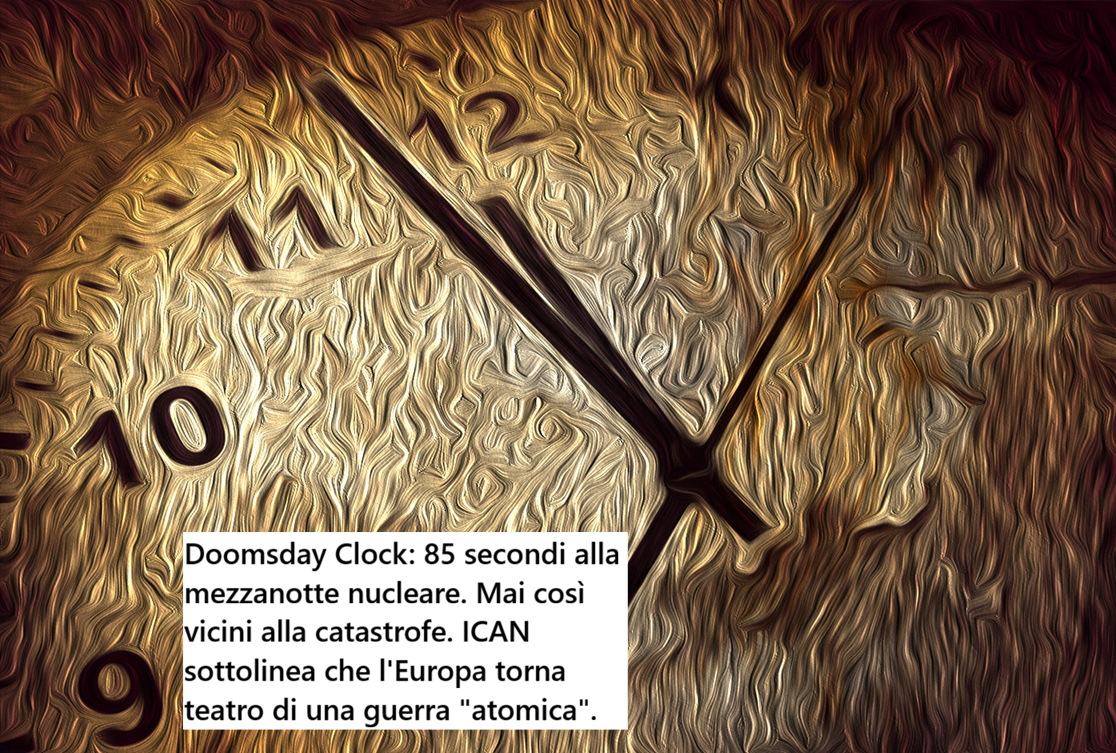 DOOMSDAY CLOCK: PIU' VICINI CHE MAI ALLA CATASTROFE. 85 SECONDI ALLA MEZZANOTTE NUCLEARE. QUI il commento di ICAN che sottolinea come l'Europa stia tornando teatro di una guerra nucleare.