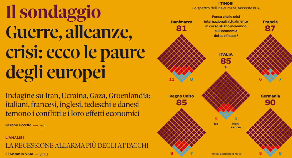 OPINIONE PUBBLICA EUROPEA: L'ECONOMIA PREOCCUPA PIU' DELLE GUERRE, CHE NON SI VOGLIONO COMBATTERE. Qui la percezione del pericolo di italiani, francesi, inglesi, tedeschi e danesi.