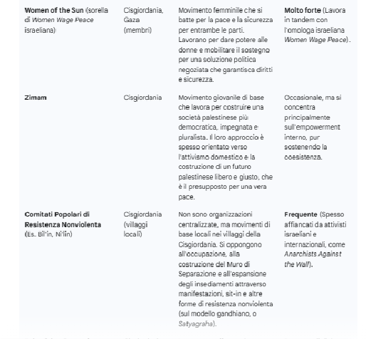 L'integrazione schematica delle informazioni sia sull'opposizione politica, sia sui movimenti sociali e pacifisti israeliani è fondamentale per rafforzare l'idea di un'alternativa interna a Netanyahu, evidenziando come l'obiettivo di una pace giusta non sia solo esterno, ma abbia profonde radici nella società civile israeliana stessa.