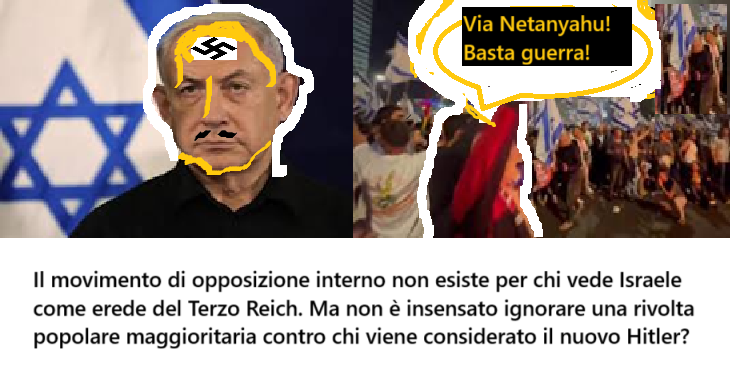 C'è chi pensa che Israele oggi sia il Terzo Reich redivivo, molti lo dicono pure ad alta voce, ma come giudicheremmo oggi chi, a suo tempo, avesse ignorato una rivolta maggioritaria della popolazione tedesca contro Hitler, se se ne fosse venuti a conoscenza? Se Bibi Netanyahu, per costoro, è l'erede di Hitler, il nuovo Hitler (questo, ripeto, secondo molte posizioni estremiste correnti, più o meno esplicitate), che penseremmo oggi degli antifascisti che avessero chiuso gli occhi di fronte a una enorme rivolta popolare contro il "dittarore" sanguinario e razzista?