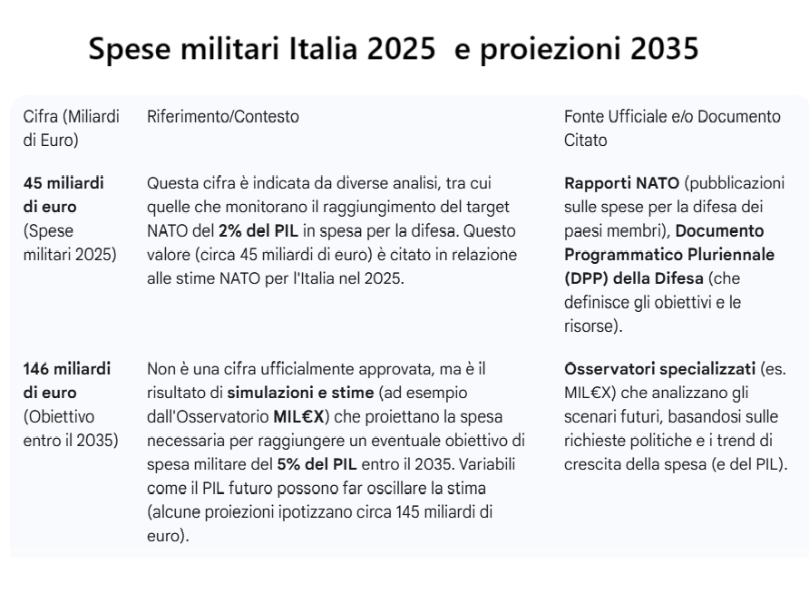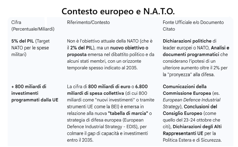 Riepilogando, l'analisi da fare non deve limitarsi a guardare gli aumenti anno per anno, ma considerare **l'effetto complessivo** rispetto al vecchio scenario programmatorio. È un modo più realistico per capire quanto costerà davvero l'allineamento agli standard NATO e quale sarà il peso sulla finanza pubblica italiana.
