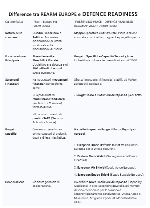 "PRESERVING PEACE - DEFENCE READINESS ROADMAP 2030" è, nella sostanza, la fase di attuazione operativa e di dettaglio del più ampio e ambizioso "ReArm Europe Plan", rinominato oggi come Readiness 2030).