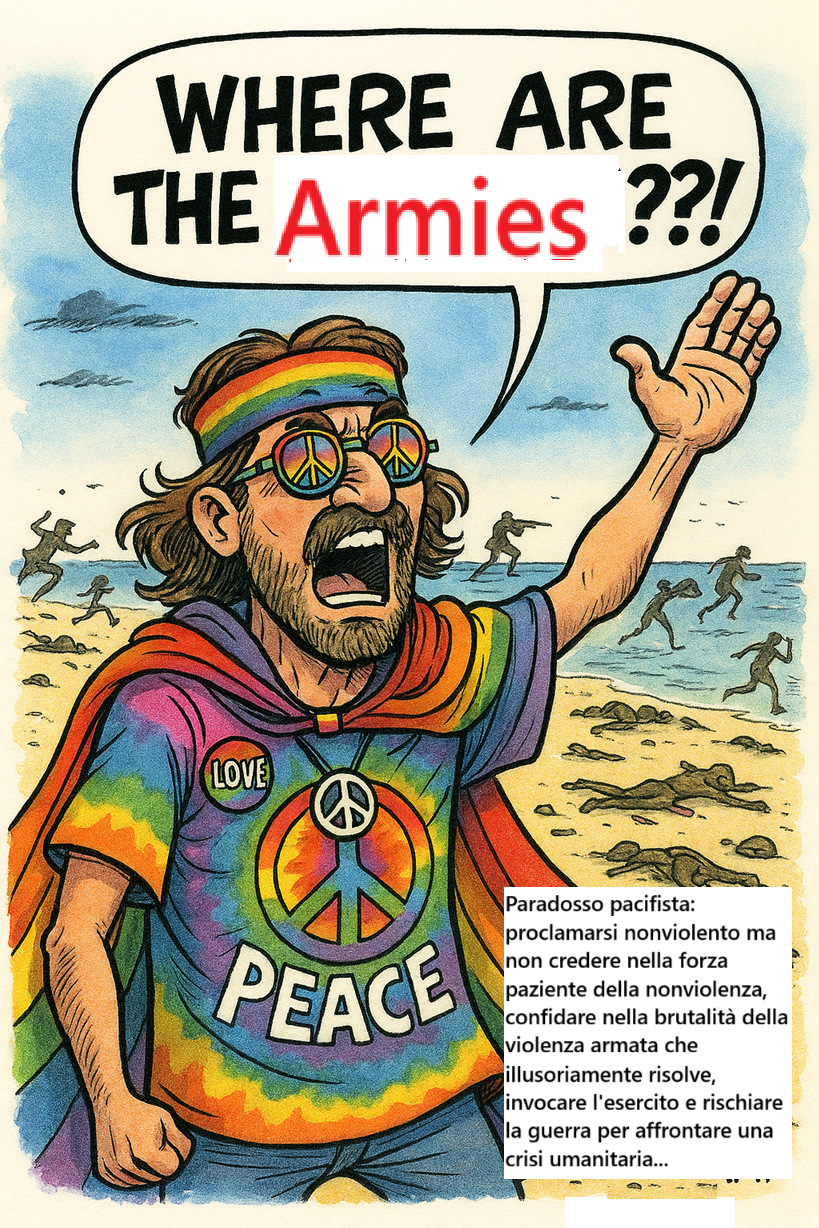 Ma quando la situazione sul campo diventa drammatica (come nel caso del massacro di civili a Gaza, definiamolo pure "genocidio"), l'atteggiamento cambia radicalmente. Lo slogan "WHERE ARE THE ARMIES??" (o equivalente richiesta di intervento armato esterno) rivela un'inaspettata, e arrabbiata, fiducia nella soluzione militare.